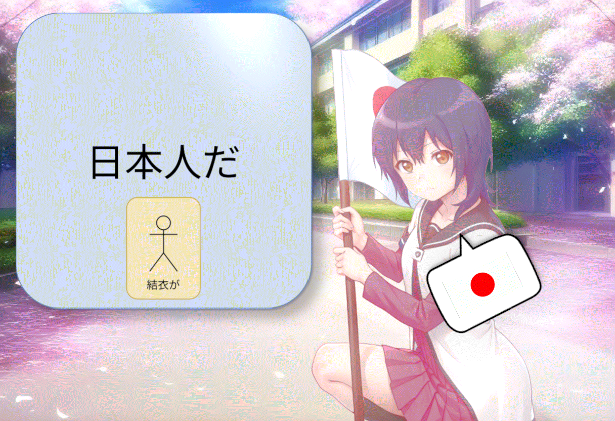 In this example, the word for “Japanese person”, 日本人 (nihonjin) has the copula だ. This indicates that whatever is marked as the core subject (in this case, Yui) belongs to the class of Japanese person. Yui is a Japanese person (but Japanese people are not all Yui).